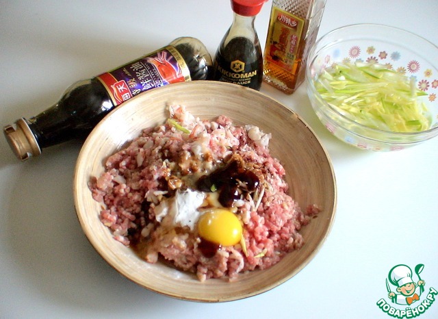 К фаршу добавить креветки натертый на терке чеснок и имбирь, кунжутное масло, соевый и устричный соусы, рисовое вино, кукурузный крахмал, яйцо. Посолить только осторожно, уже был добавлен соевый соус. Хорошо перемешайте, фарш обязательно выбить и дать настояться.