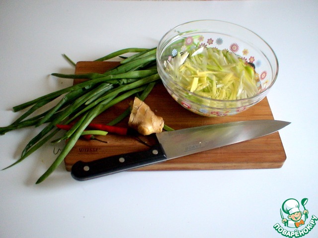 Зелёный лук (белую часть) нарезать вдоль, имбирь тонкой соломкой, после чего залить холодной водой и оставить минимум на 20 минут. Слить воду.
