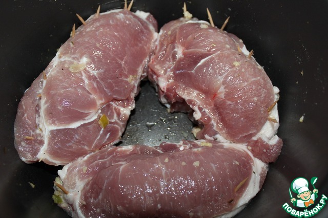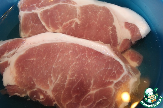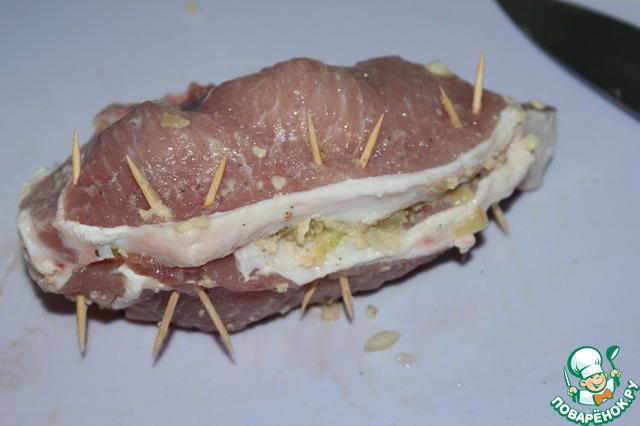 Корейку достать из маринада и просушить бумажным полотенцем. Срезать жир. В центре боковой части каждого кусочка, сделать длинный разрез, так что бы кусок практически разделился на двое.