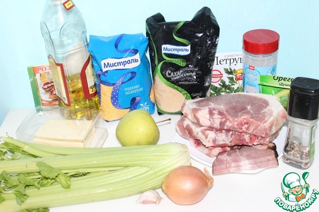 Подготовим ингредиенты. Лук, чеснок, грудинку, яблоко и сельдерей мелко порезать. Пшено промыть и отварить.