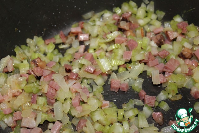 Подготовим начинку. В глубокой сковороде, на смеси сливочного и оливкового масла обжарить лук, через несколько минут добавить грудинку, готовить еще 2-3 минуты, добавить сельдерей, затем специи, потушить пару минут и снять с огня. Немного остудить. Добавить приготовленное пшено и яблоко и хорошо перемешать.