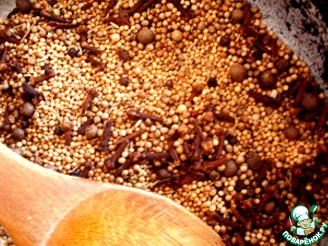 Начать приготовление этого блюда лучше всего с составления гарам масалы. Каждая индийская хозяйка делает эту индийскую смесь пряностей сама, по своему- единственно правильному (а как –же!) рецепту. Я люблю такой вариант- на раскаленной сухой сковороде в течении 15 секунд, постоянно помешивая, прогреть специи: на 6-7 бутонов гвоздики я беру по полной без горки кофейной ложке целых семян кориандра, тмина, зиры, горчичного семени, смеси перцев. После прогревания толку в ступке, добавляю порошок (к сожалению, целых у меня нет) кардамона и имбиря, перемешиваю и храню в плотно закрытой банке. Хватает на долго. Для этого блюда понадобится кофейная ложка готовой смеси и еще по щепотке кориандра и горчичного семя.