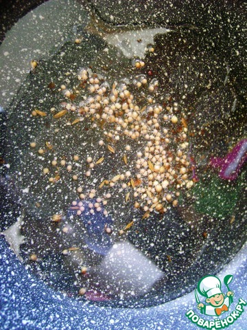 Разогреть в сковороде ложку масла и всыпать зерна кориандра и горчицы. Накрыть крышкой и слегка потряхивать сковороду, пока зерна горчицы не начнут стрелять.