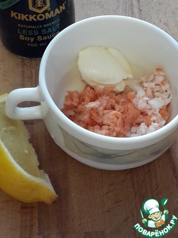Нарубите мелко слабосоленую семгу, добавьте мясо криля (или мелко нарубленные мелкие отваренные креветки), сок лимона, майонез и соевый соус.