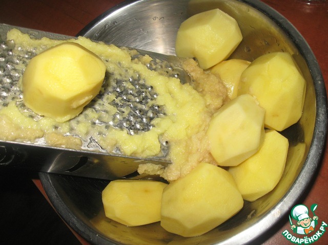 Очищенный и помытый картофель натираем на мелкой тёрке (как на драники)