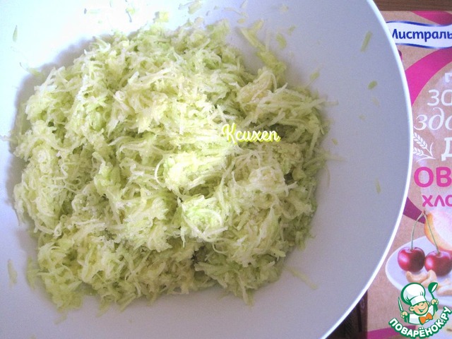 Очищенные кабачки натираем на мелкой тёрке, добавляем щепотку соли. Всё перемешиваем и оставляем на 5-10 минут. Далее кабачки отжимаем через сито.