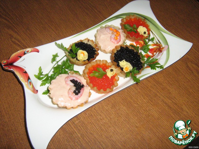 Выкладываем наши продукты в тарталетки и украшаем на ваше усмотрение. Приятного аппетита.