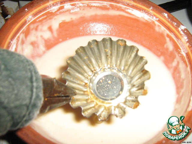 Делаем тесто как на тонкие блины. Яйцо взбиваем с молоком добавляем, шепотку соли и сахара, муку и чуть соды. Даём тесту отдохнуть, чтобы набрало клейковины, и преступаем к выпеканию. Опускаем нашу конструкцию в кипящий фритюр, хорошенько нагреваем и сразу окунаем в тесто, которое приваривается к корзиночке.