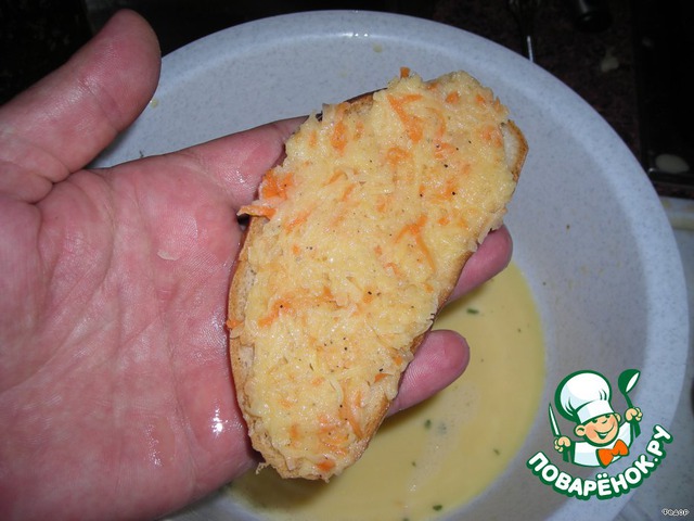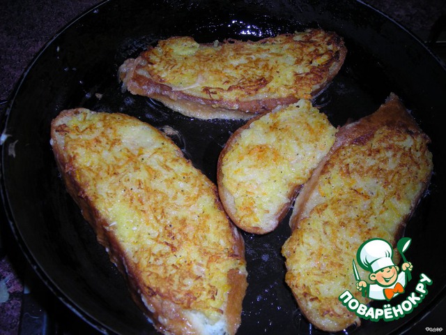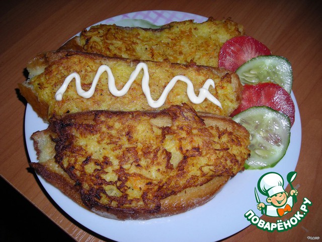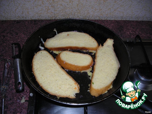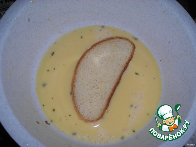 Следущий шаг - берём ломтик нарезанного уже батона и макаем его одной стороной в кляр(предварительно поставив сковороду с маслом на разогрев)