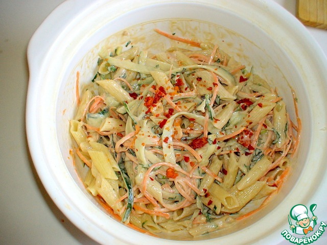 Макароны лучше взять перья или короткие трубочки. Отварить по инструкции. Откинуть на дуршлаг, вернуть макароны в кастрюлю, добавить овощи с орехами, заправить соусом. Дать салату настояться минут 10. Посолить, поперчить по вкусу.