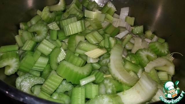 Сельдерей помыть, обобрать и отложить в стторону листовые части (их нужно использовать в конце) нарезать кусочками, залить кипятком и проварить 5 минут.