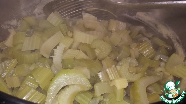 Теперь в кастрюлю отправляем сельдерей вместе с бульоном, солим и перчим, провариваем до готовности ингредиентов. На стадии " почти готово" отправляем вариться и листовой ( оставленный нами) сельдерей.