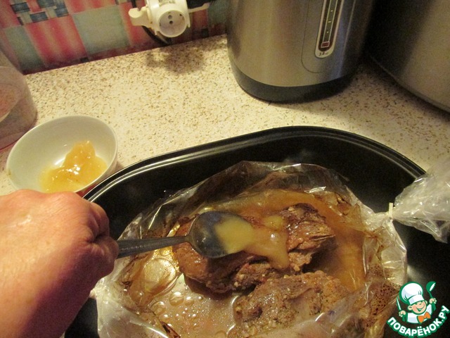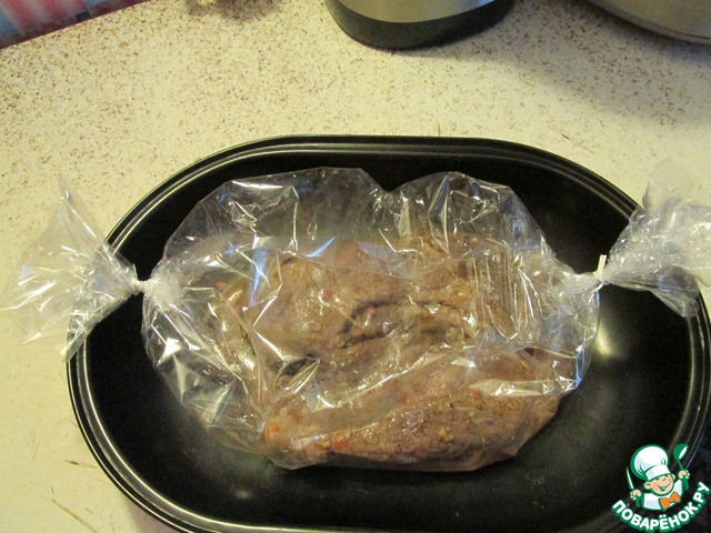 Мясо вынимаем из маринада и помещаем в рукав для запекания, один конец рукава завязываем и в свободное отверстие выливаем маринад, завязываем и ставим в духовку при t 200 на 1 час, не забывая сделать несколько проколов в рукаве для выхода пара.