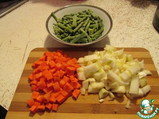 Пока готовится мясо мы будем готовить подгарнировку. Для этого режем морковь кубиками, лук крупно кубиками, фасоль полосками по 3-4 см. длиной (у меня заранее подготовленная и замороженная с лета)
