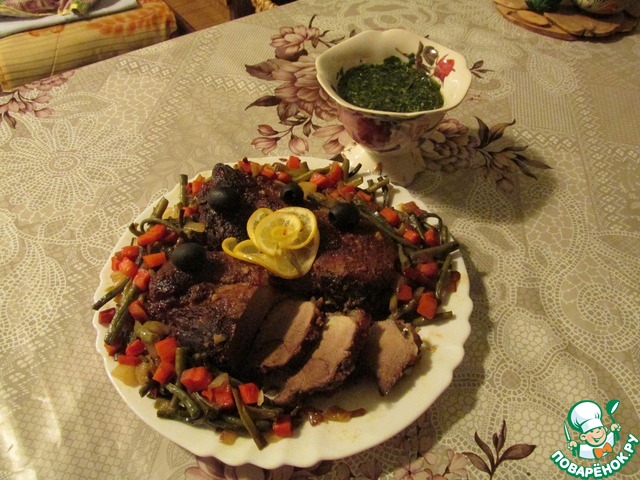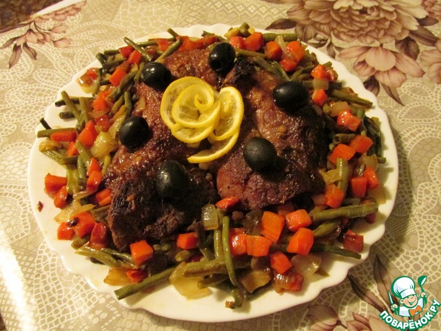 Обжариваем на растительном масле сначала морковь до полуготовности, добавляем лук и фасоль, присаливаем и тушим под закрытой крышкой 7-10 мин., до полной готовности моркови, иначе она не проявит своего вкуса, а фасоль если чуть хрустит - самое то. Мясо достаем из духовки, укладываем на блюдо, вокруг раскладываем овощи и подаем к столу с любимым гарниром (но можно и без него). Сок оставшийся в рукаве можно слить в соусник, добавить по желанию любой зелени и приобщить к основному блюду. Всем приятного аппетита!