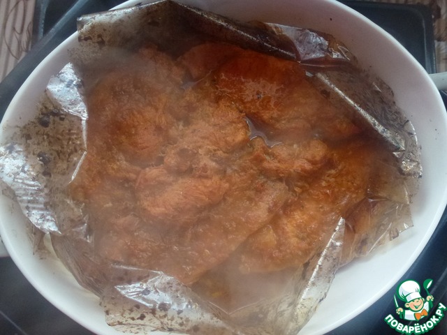Вынуть мясо из пакета, посолить и положить в рукав для запекания. Завязать с обоих краев и положить на противень. Запекать мясо при 180" примерно 1,5 часа.