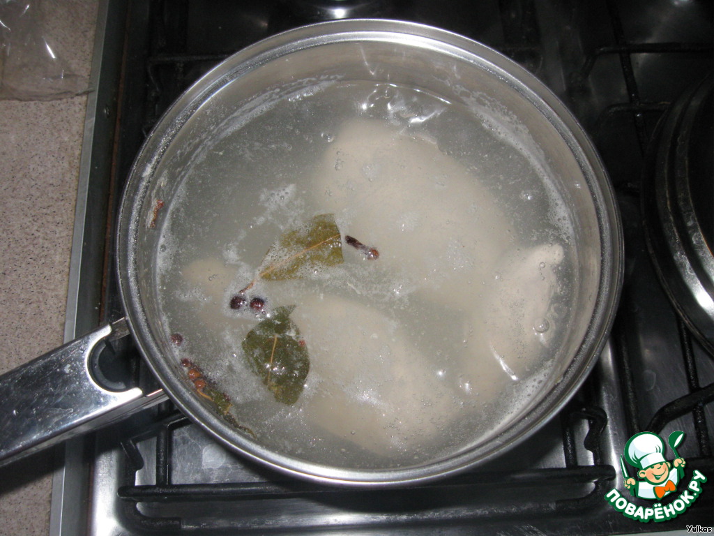 Варим куриное филе в подсоленной воде (я добавляю лавровый лист, черный перец горошком и гвоздику).