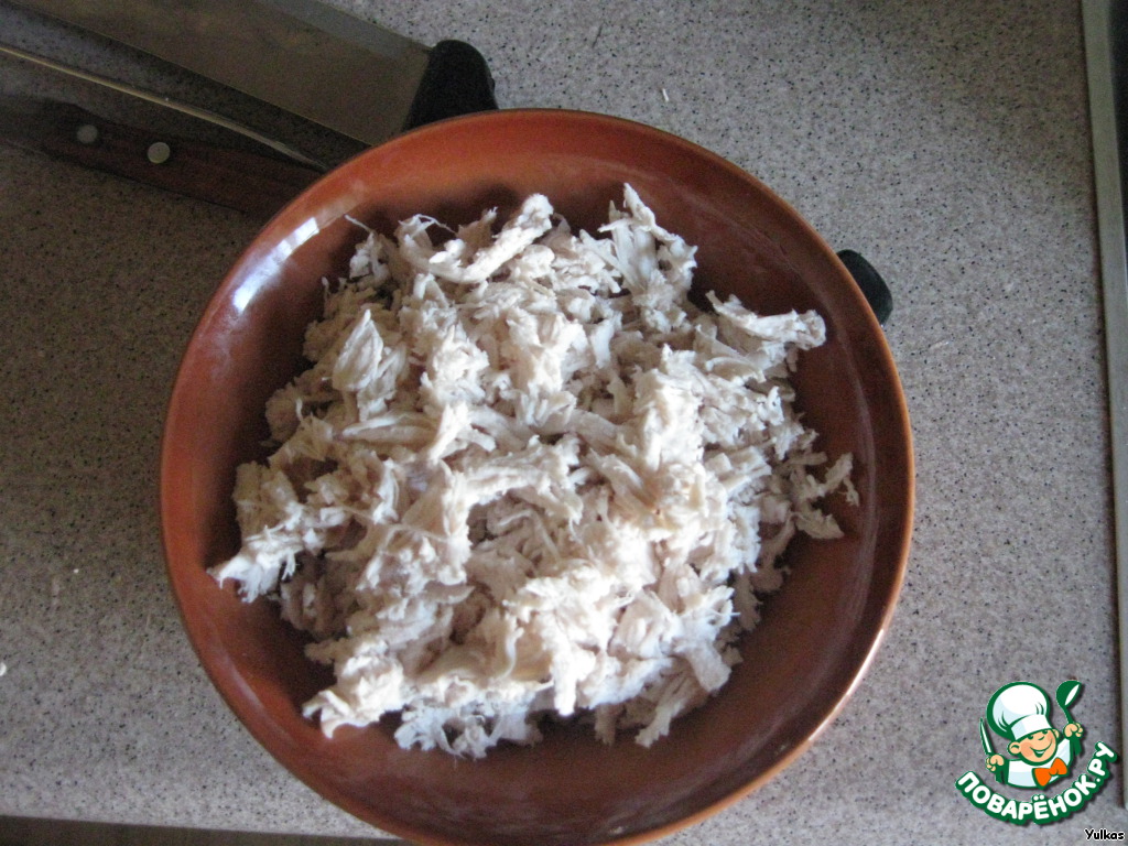 Куриное филе сварилось, разбираем его на волокна, длинные куски режем на более короткие.