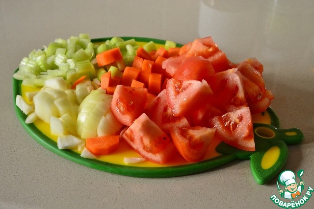 Овощи (лук, морковь, сельдерей, помидор) моем и нарезаем крупно.