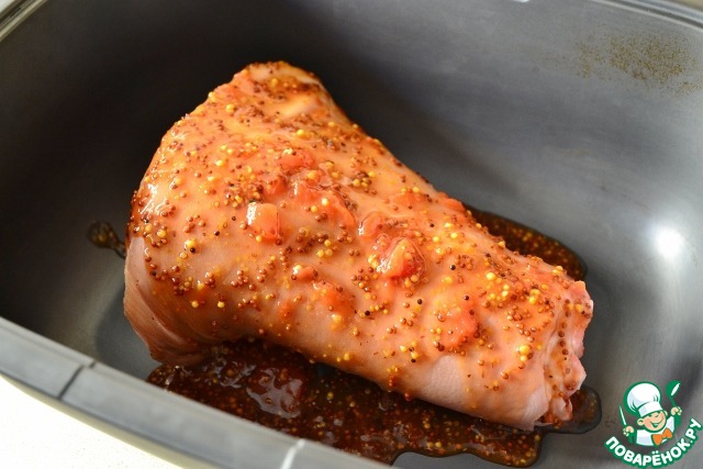 Рульку моем, обсушиваем, выкладываем в форму и обмазываем глазурью.