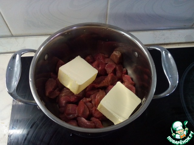 Говядину порезать кусочками 2 на 2 см (у меня на фото кусочки не очень крупные, но в оригинальном рецепте кусочки должны быть крупноватые).