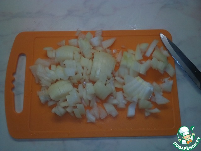 Две крупные луковицы порезать полукольцами или чуть меньше. Лука должно быть много, им мясо не испортишь.