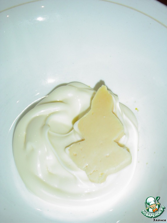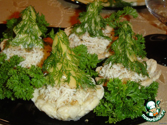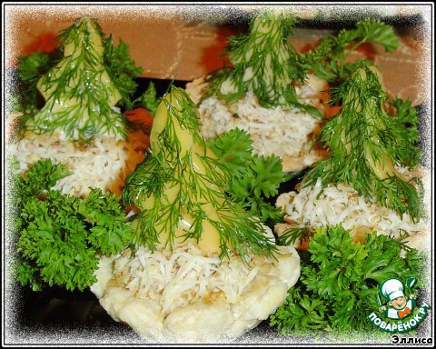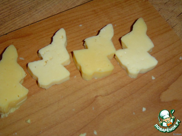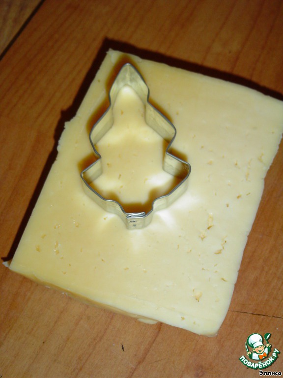Из сыра вырезаем при помощи формочки (если нет формочки, то можно сделать шаблон, и с его помощью вырезать елочки) елочки.