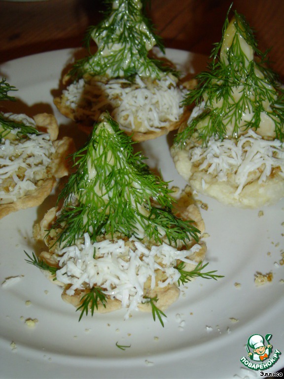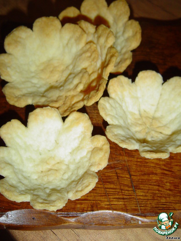 Из готового слоеного теста выпекаем тарталетки, предварительно раскатав тесто, вырезаем кружки (по желанию сделать лепесточки). Кружки размещаем в формочки, смазанные маргарином, прокалываем в нескольких местах и выпекаем при температуре 180 гр. до золотистого цвета.