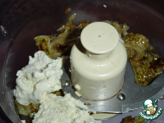 Соединяем мякоть баклажана с творогом, смешиваем блендером до состояния пюре.