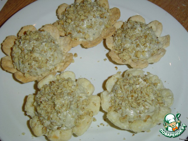 Этой смесью фаршируем тарталетки и посыпаем измельченными орехами.