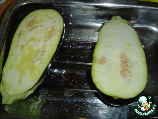 Разрезаем баклажан вдоль, каждую половинку прокалываем, солим, сбрызгиваем оливковым маслом и запекаем при температуре 180 гр. 30 минут.