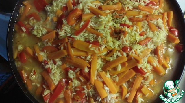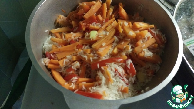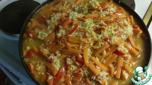 В подливу всыпать рис с овощами, добавить воды, чтобы жидкость покрывала рис, перемешать, по-необходимости добавить еще соли и специй и варить до готовности. Я много воды не добавляла, рис и так хорошо приготовился, и был рассыпчатым.