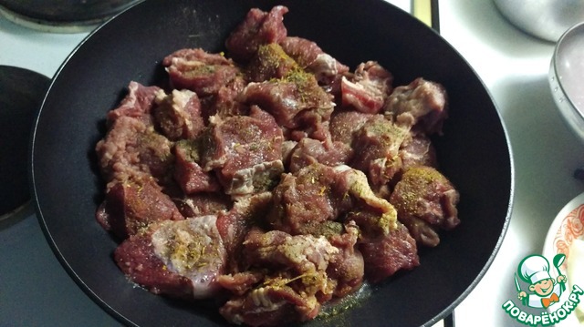 Разрезать мясо на порционные куски, посолить, посыпать специями и обжарить с двух сторон на растительном масле (рекомендую хлопковое или льняное нерафинированное)