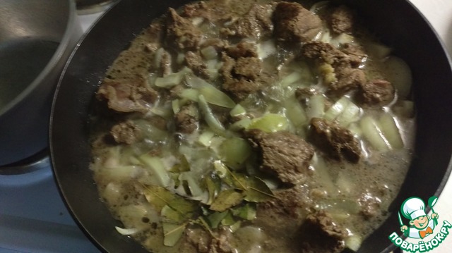 Залить мясо с луком горячей водой, добавить лавровый лист, посолить и варить до готовности.