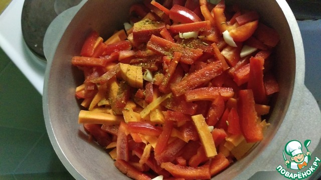 Пока мясо варится, в другой большой сковороде или казане поджарить натертую на крупной терке морковь, порезанный соломкой перец и порубленный чеснок, посолить, добавить специи.