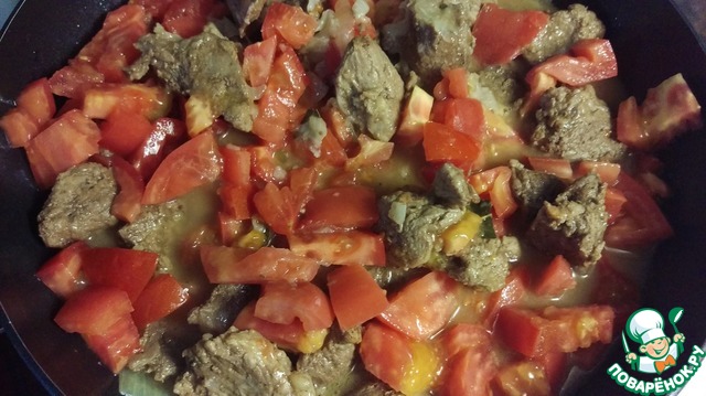 Мясо можно вынуть из томатной подливы, или, если размеры сковороды позволяют, оставить до конца готовки. Я мясо вынимать не стала.