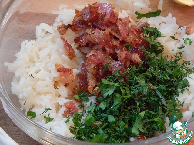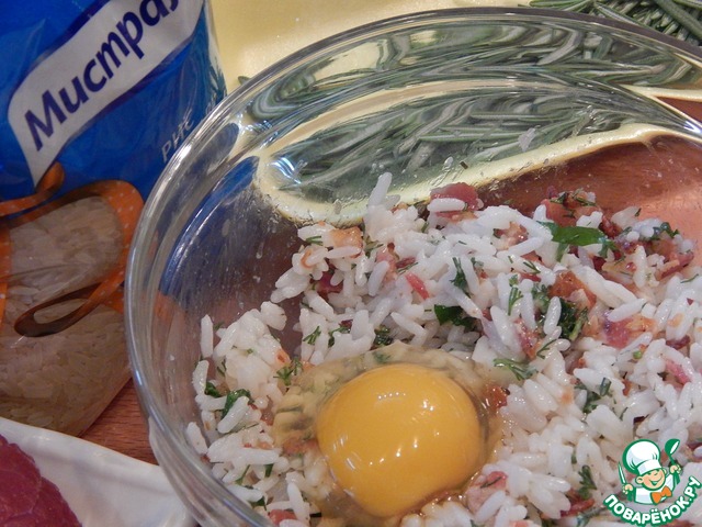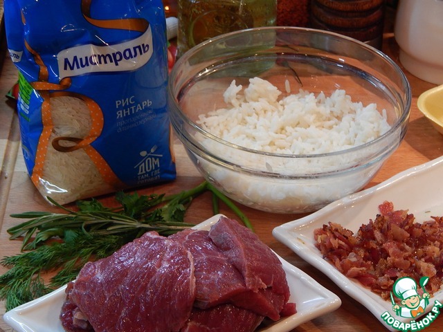 Вот наши продукты. Рис я отварила заранее и лук обжарила с грудинкой.