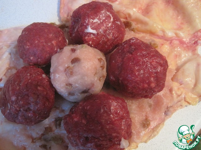 Кладем в виде цветочка шарики с творогом и мясом. В середине творожный шарик, завернутый фаршем из куриного филе и изюма, вокруг с говядиной.