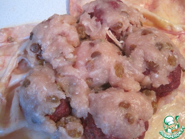 На нее укладываем фарш из филе и изюма.