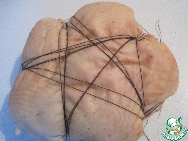 Заворачиваем края шкурки курицы и кладем швом вниз.