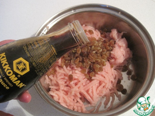 Филе куриное пропускаем через мясорубку, добавляем ошпаренный изюм и соевый соус 2 ст. л.