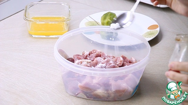 Мясо, порезав кубиками, замаринуем на 40 минут. При этом нужно его посолить, поперчить, добавить сок одного апельсина, порезанные кусочки двух киви и две столовые ложки майонеза. Все перемешиваем.