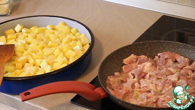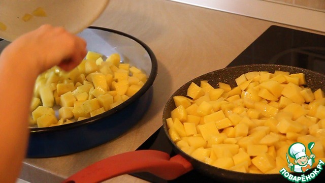 Тем временем очищаем картофель и нарезаем его кубиками. Половину порезанного картофеля поджариваем в сковороде на растительном масле 3-4 (три - четыре минуты) на максимальной температуре. При этом картофель нужно подсолить и поперчить. Оставшуюся половину картофеля сразу выкладываем в форму для запекания.