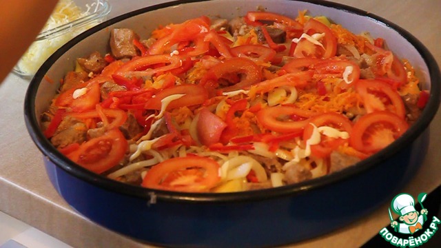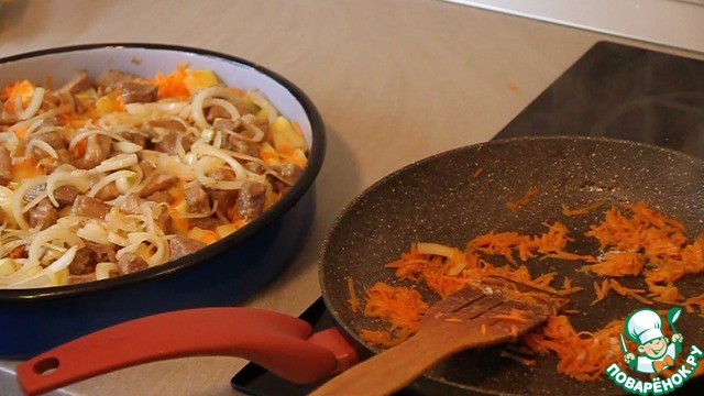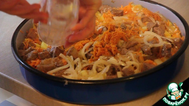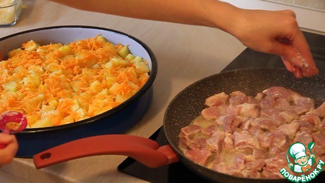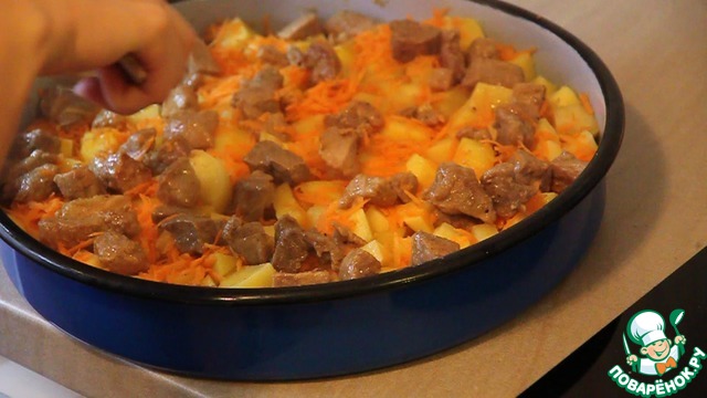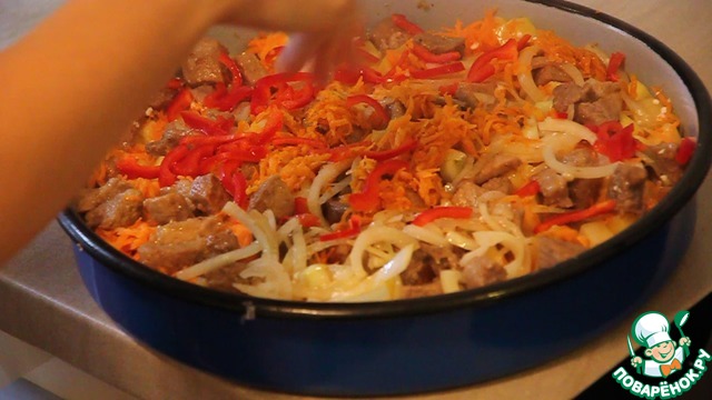 Сверху морковки выкладываем поджаренное мясо.