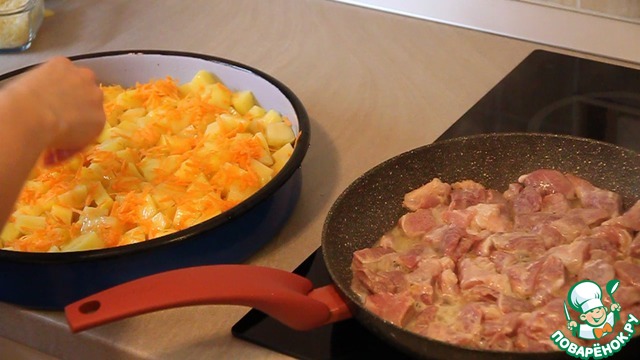 Пока жарится мясо, на картофель выкладываем натертую сырую морковь 1 (одну) штучку.
