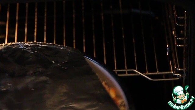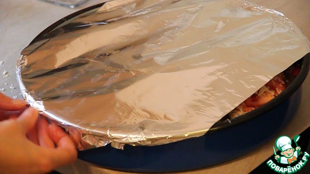 Закрываем форму фольгой. Можно использовать форму для запекания с крышкой, тогда фольга не понадобиться.