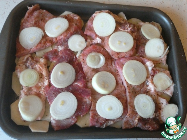 Мясо отбить, посолить, добавить специи по вкусу. Картофель порезать поперёк. Лук - кольцами