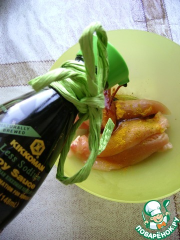 Филе разрезать на 4 части -я брала 2 внутренних филе –и полить соевым соусом и ложкой апельсинового сока, посыпать порошком карри и перемешать. Оставить мариноваться на полчаса.