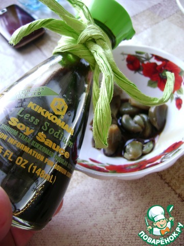 В мисочке размять печеный чеснок. Можно запечь его в микроволновке –просто выложить целиком и запечь пару минут. Я специально положила в недавний плов несколько головок в запас. К чесноку добавить соевый соус, сироп, сок лимона и апельсина и под конец масло. Хорошо растереть, если есть желание-можно взбить блендером, я оставила так.