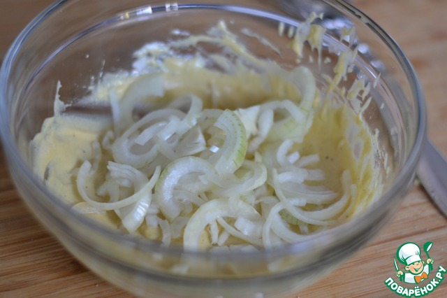 Лук нарезать на полукольца и, добавляя его в массу, размять руками.